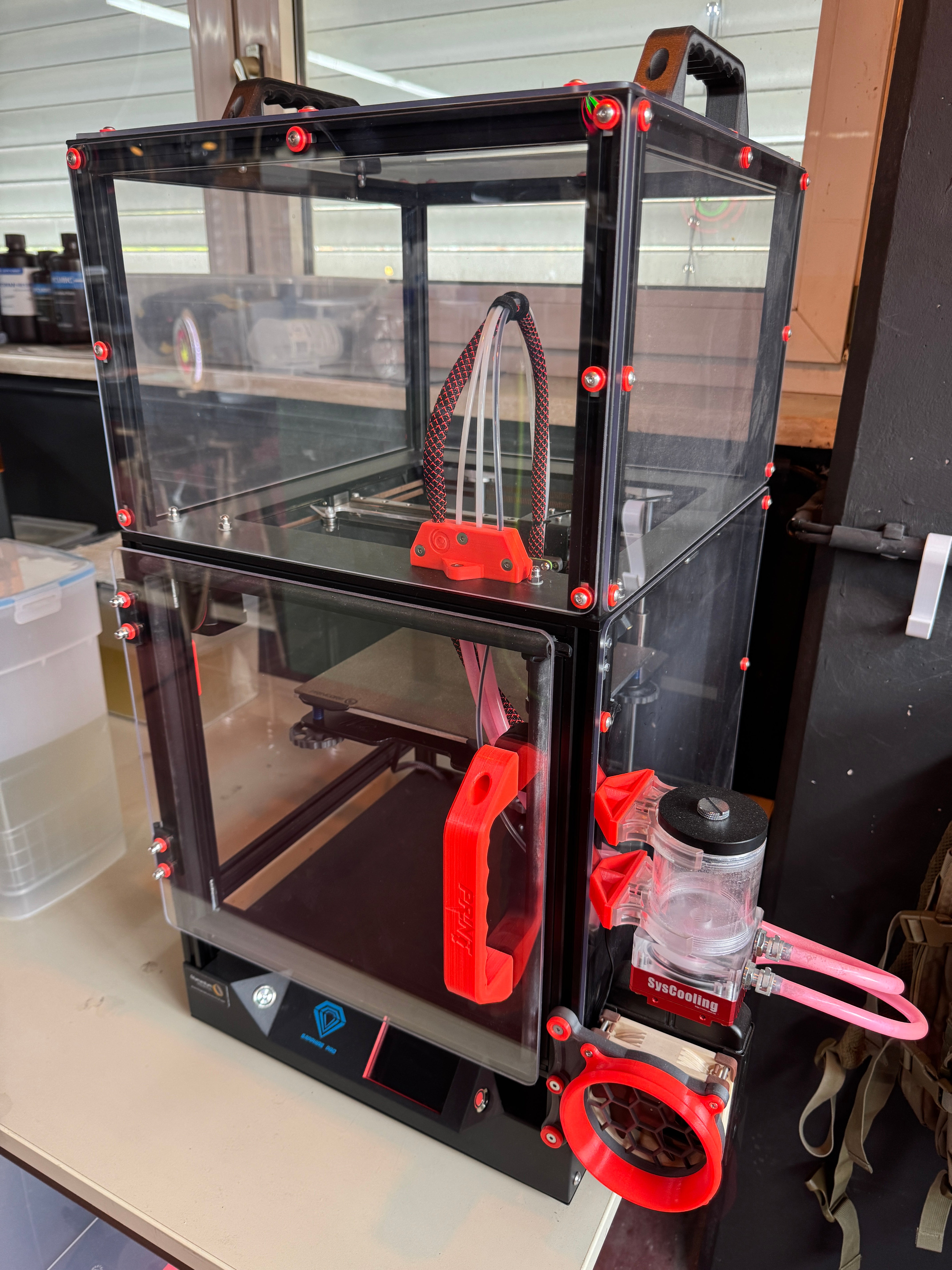 Umgebauter 3D Drucker der Firma Sapphire. Es besitzt eine hochwertige Wasserkühlung und eine Lerdge Platine inklusive Steuerung.