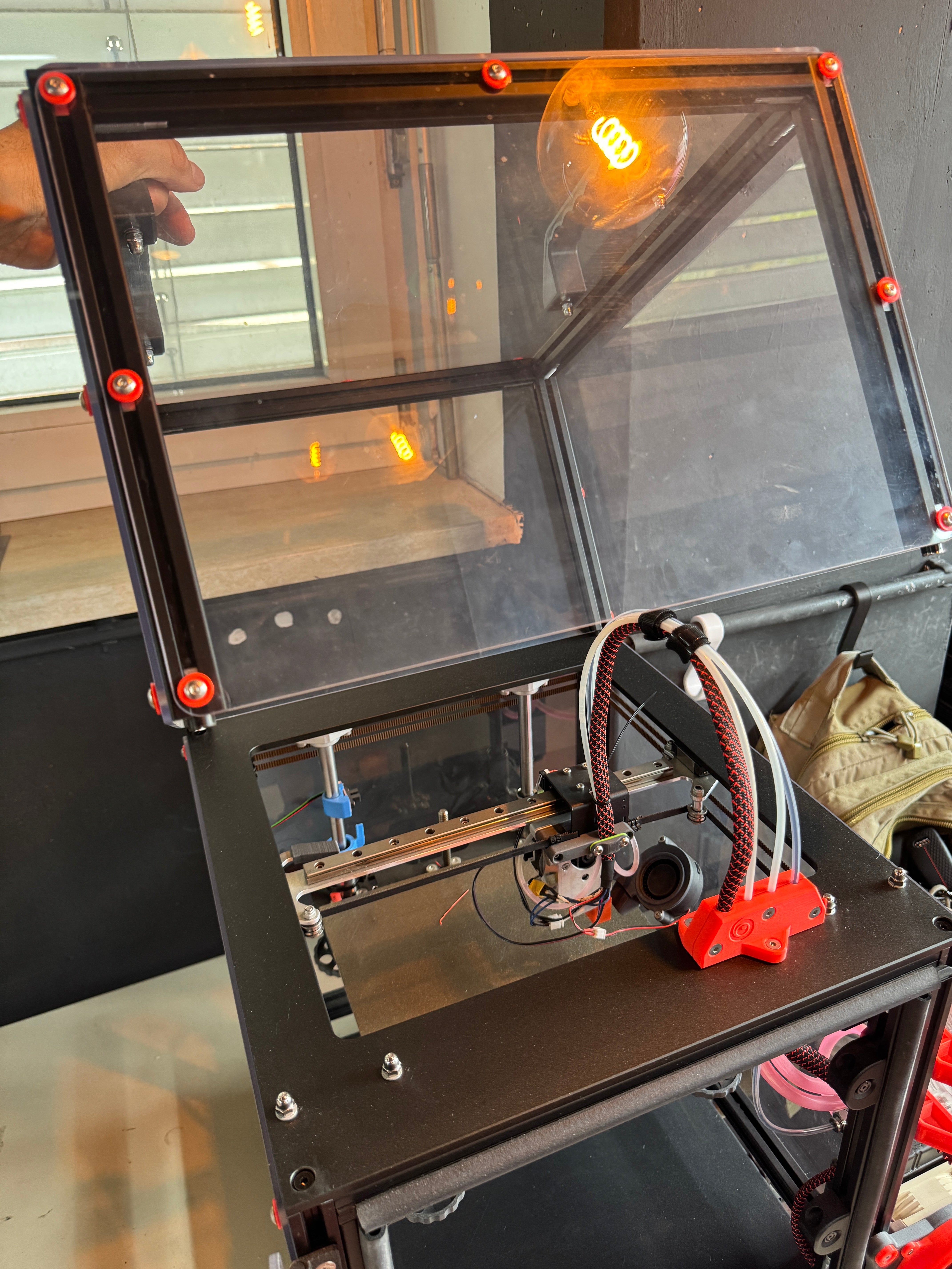 Das komplette Gehäuse wurde mit Polycarbonat-Platten umhaust, um auch z.B. ABS problemlos drucken zu können.